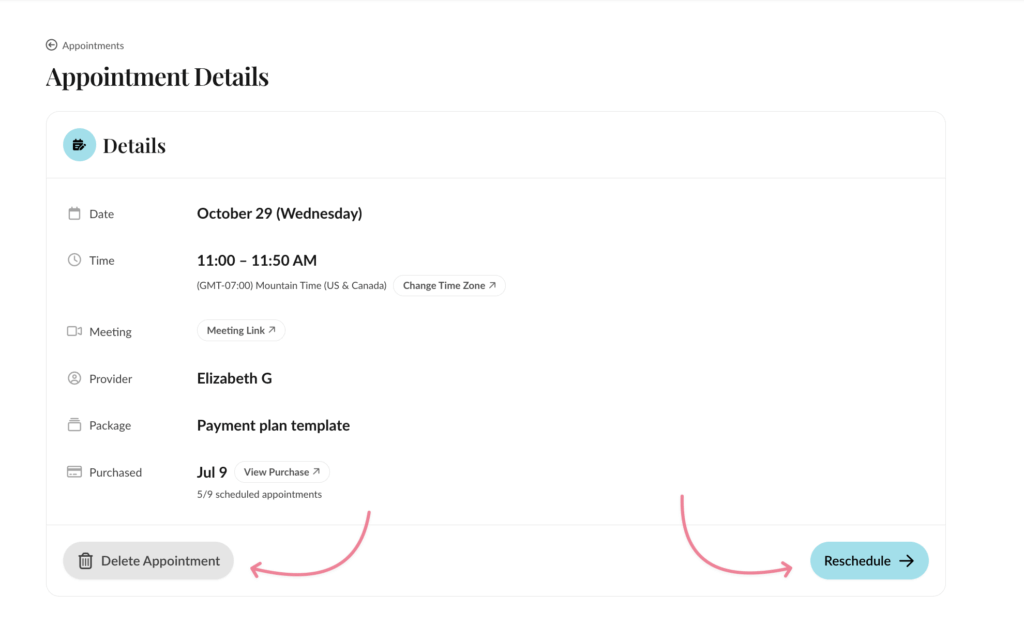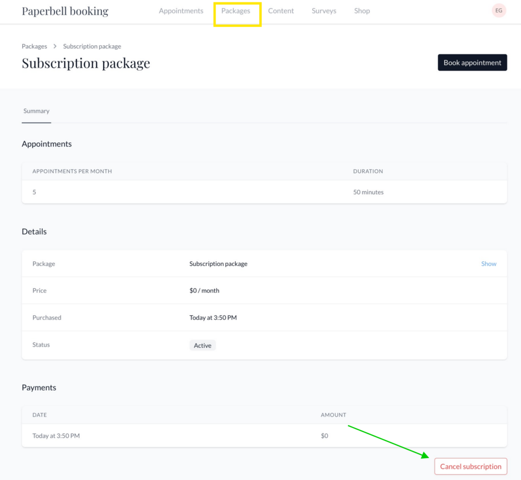 This page contains a list of all your packages, the number of appointments you have left to book in your packages, and if a subscription or payment plan package is active, canceled, or expired.
