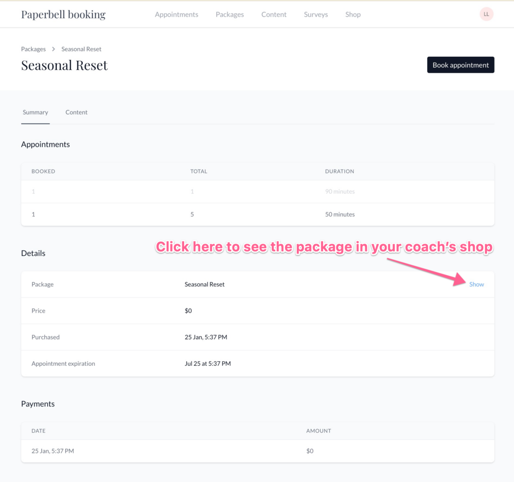 Go to Appointments and click the Book Appointment button in the top-right corner, which will only appear if you have unused sessions to book.
