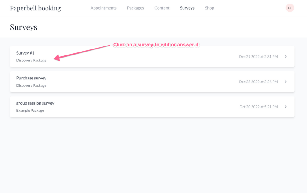 Click on a survey to fill it out, or to add or change your answers.