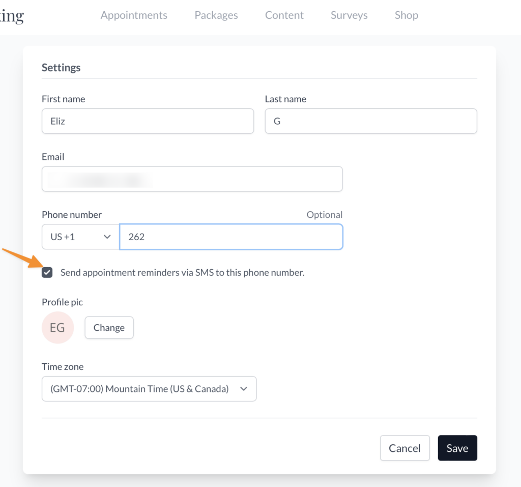 Add your phone number on your Settings page to receive SMS reminders before appointments.