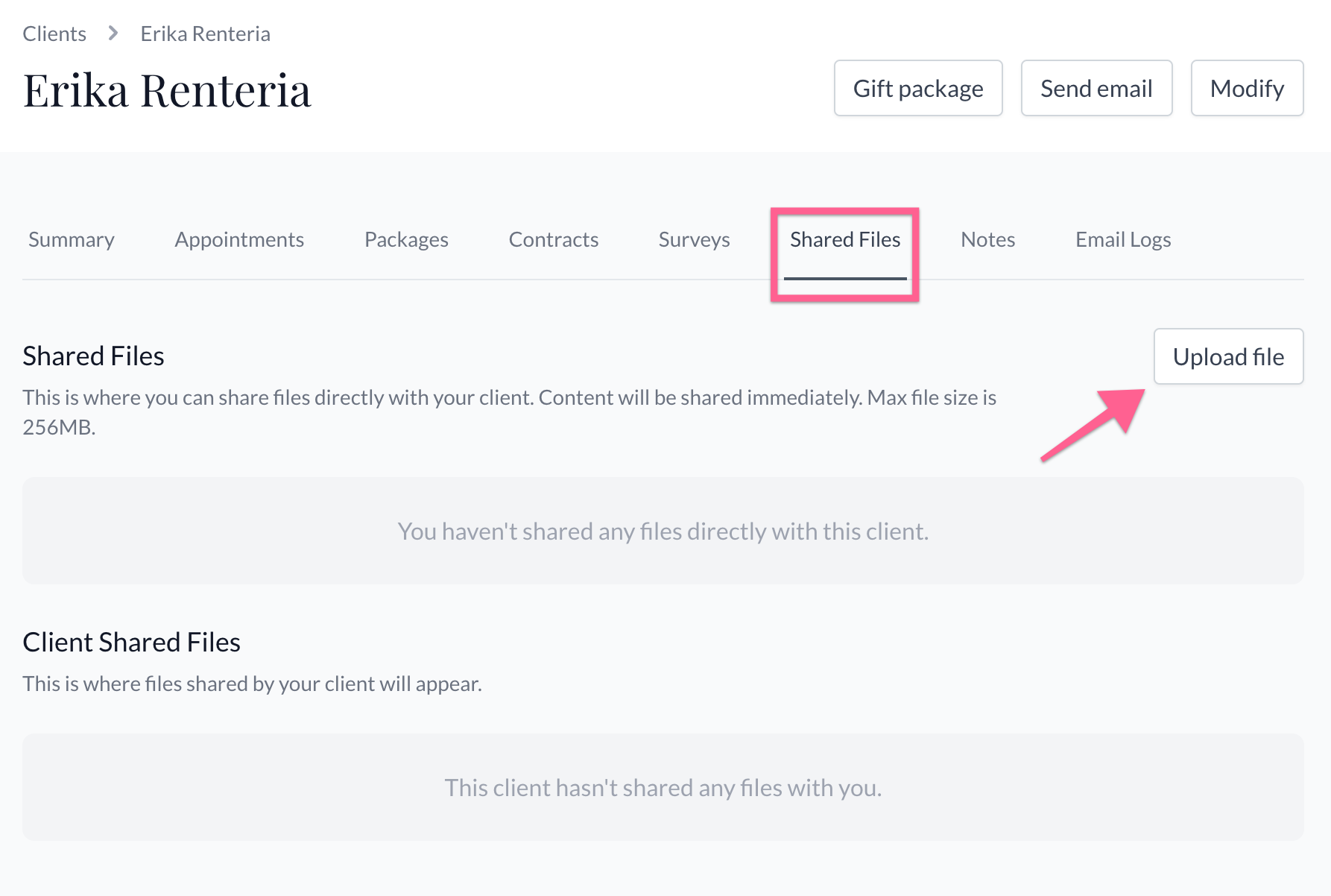 You will find this fancy-shmancy new option by searching for the client in your “clients” section and then clicking on the “Shared Files” tab.