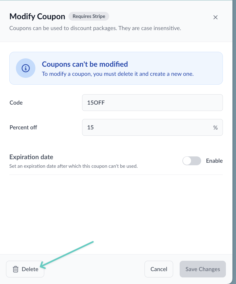 However, payments will remain unchanged for any client who has already used the code. For example, if a client used the code to get 20% off their ongoing subscription, their payments would still charge at the discount price after you archive the coupon.