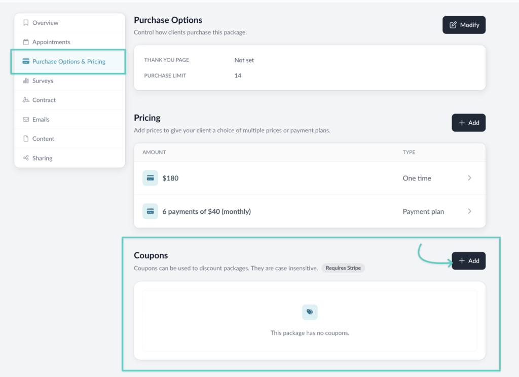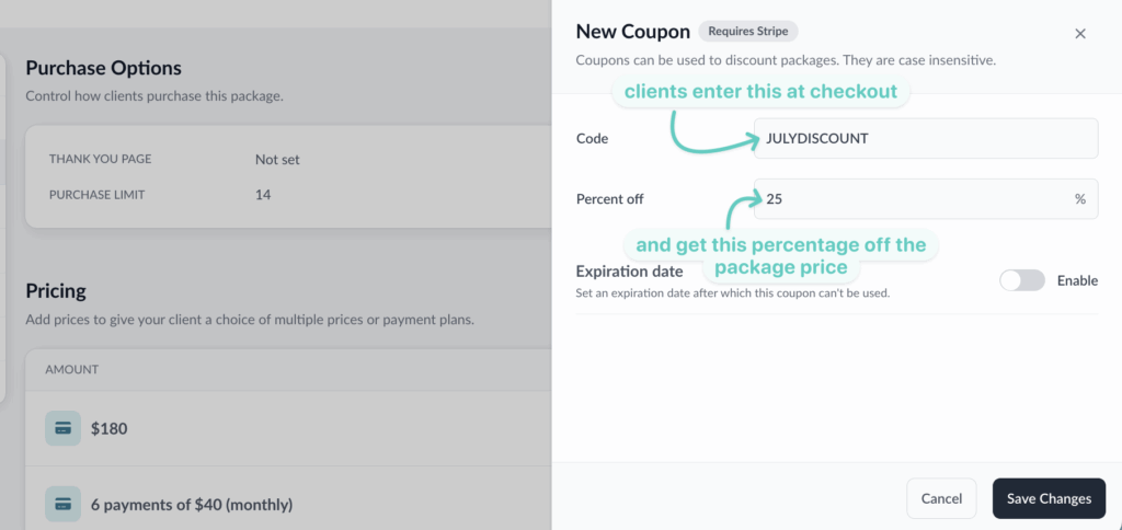 Coupon codes are also useful for giving special prices to VIP clients. For example, you could give clients who already have an ongoing subscription with you a coupon code to purchase additional one-off sessions at a discount.