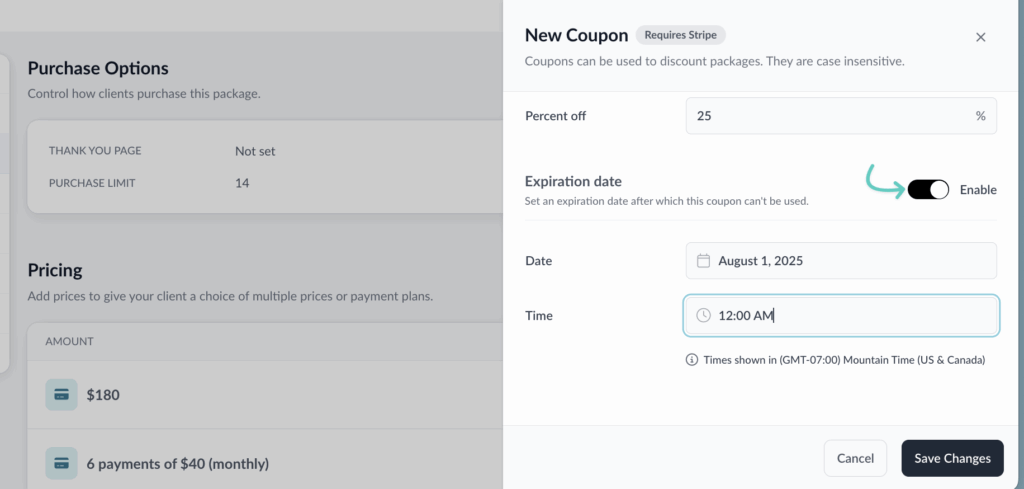 Another scenario you’d use a coupon is if a client purchased one package but wants to switch packages and “apply the credit” from their original purchase to the new package. You’ll create a coupon that reflects the difference in the two prices, and send it to your client for them to use for the new purchase. (Psst, don’t forget to remove any remaining appointments from their original purchase!)