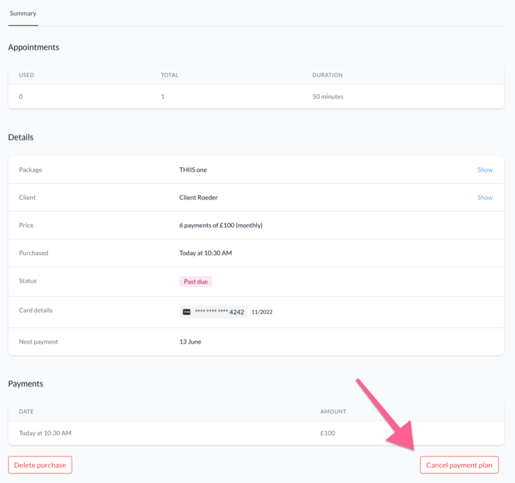 If you cancel a payment plan, your client’s remaining scheduled sessions will stay in your calendar. They’ll also keep any appointments they haven’t yet booked.
