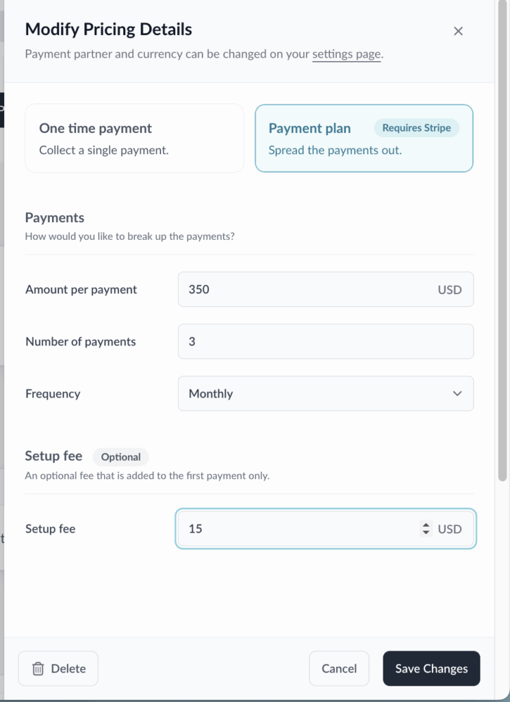 Yes! If someone has already purchased the package on that payment plan, you’ll need to archive the existing payment plan first. This won’t affect your existing client on the payment plan — new clients will see the new payment plan.