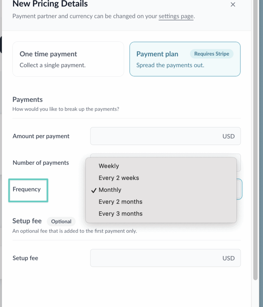 A payment plan allows your client to make multiple payments over time instead of just one payment up front. You can set this up for the payments to go through weekly, every two weeks, monthly, every two months, or every three months.
