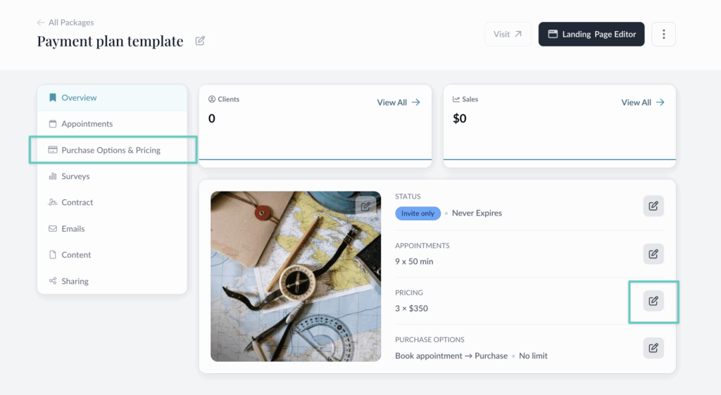 To change or add a payment plan to an existing package, click into the Purchase Options & Pricing section of your package.