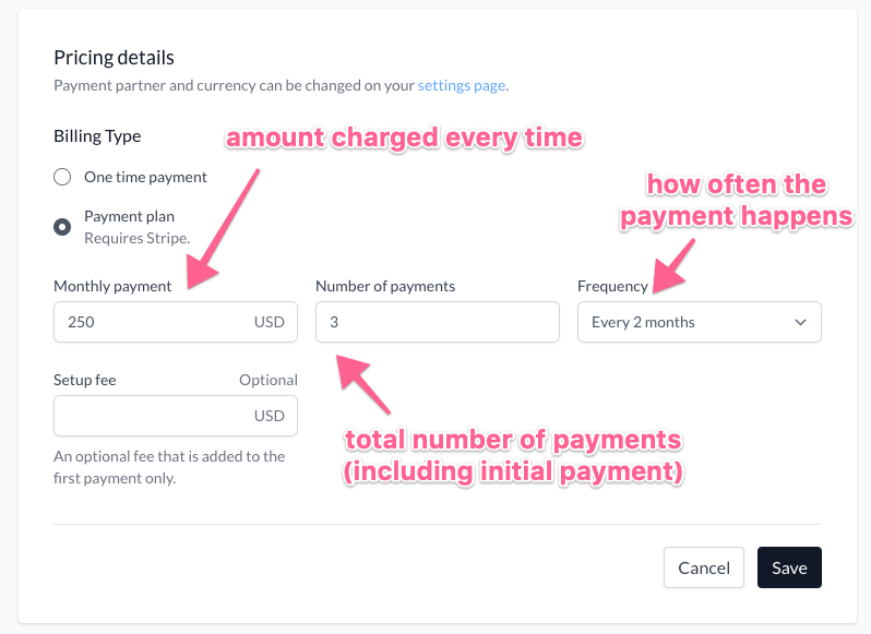 This is commonly used for longer coaching engagements. For example, you may have a package that includes six sessions and is paid with a six-payment plan of $200 each payment. You can also think of this as an installment payment.