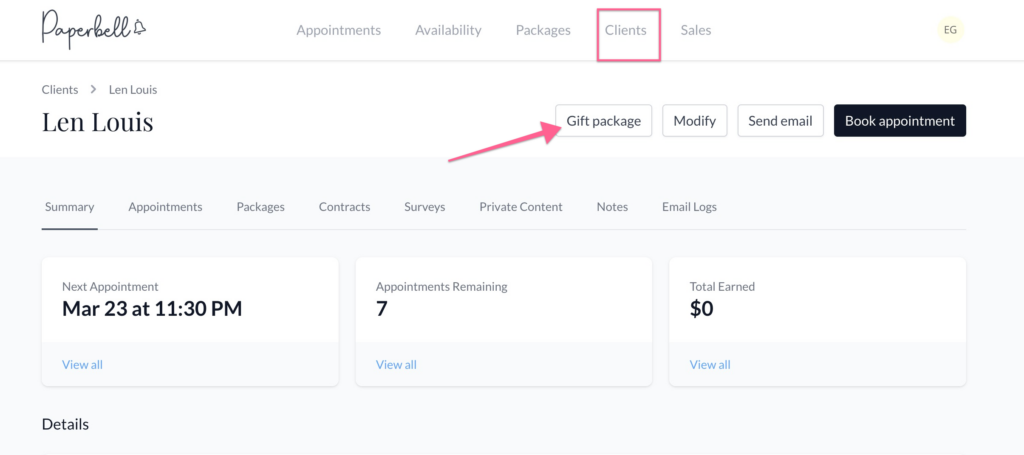 When you give a package, your client receives a gifting email from Paperbell with instructions to book appointments. Give your client a heads up so they know to look out for this email.