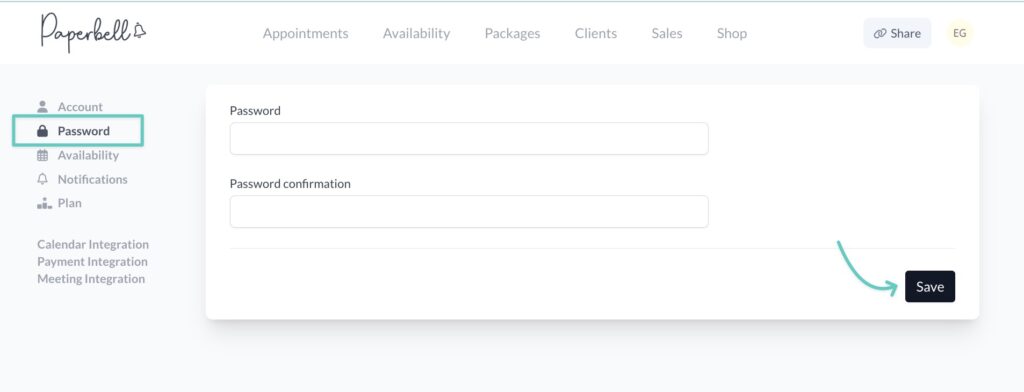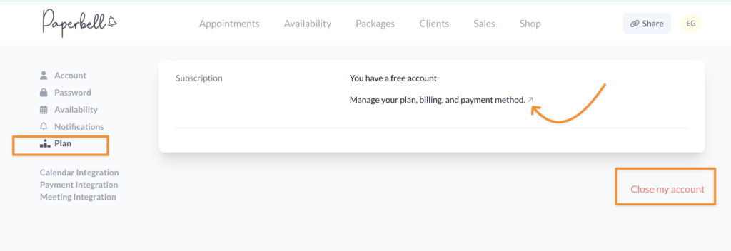 This is also where you’ll find the option to cancel your plan or after that, the option to close your account (please tread lightly here if you’ve been using Paperbell with clients).