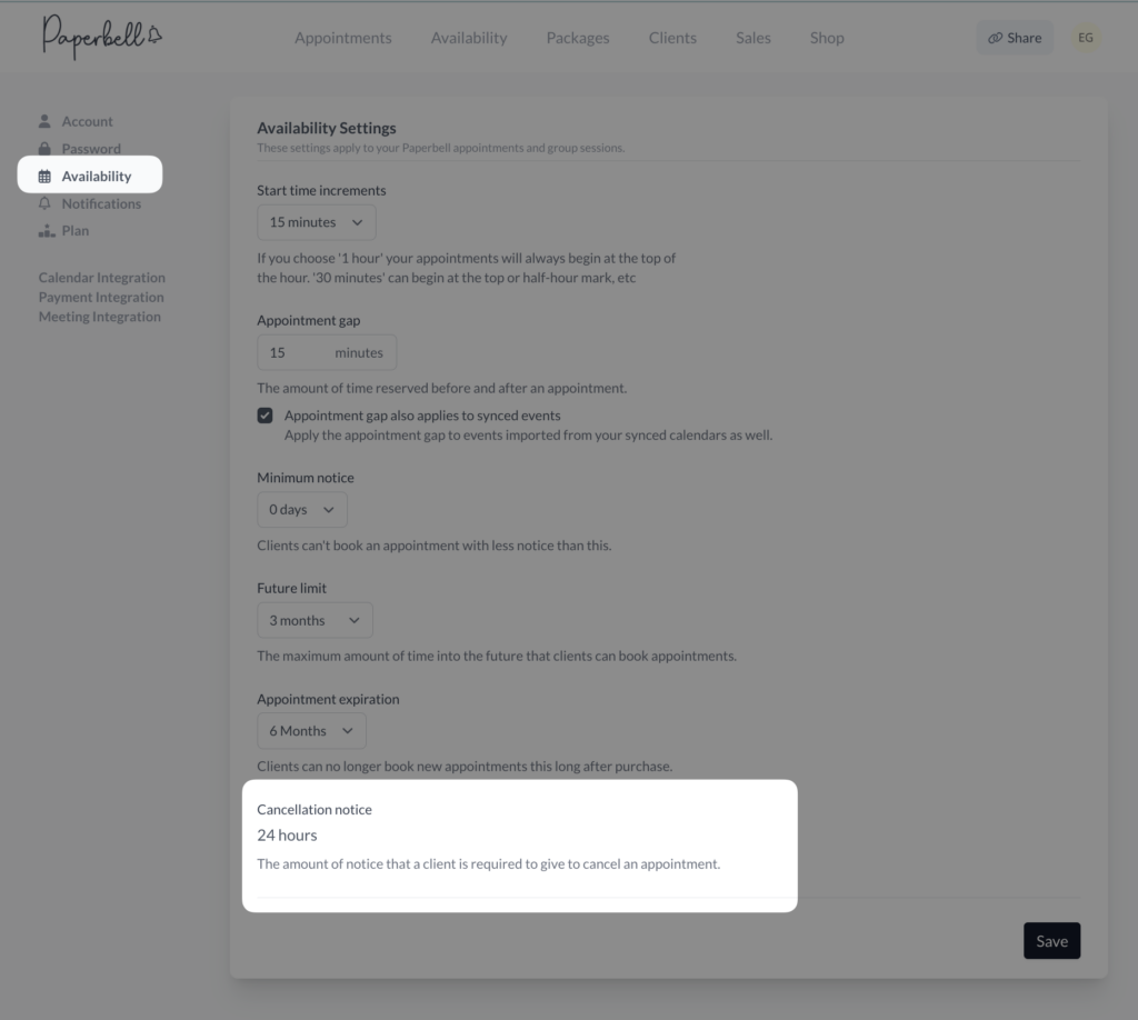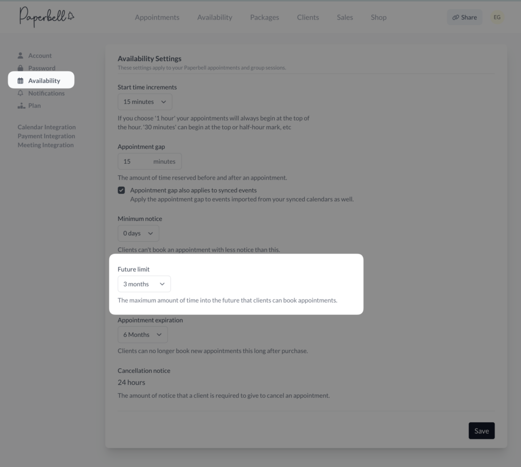Future limit determines the maximum amount of time into the future that clients can book appointments and “cancellation notice” defaults to 24 hours — the amount of notice that a client is required to give to cancel an appointment.