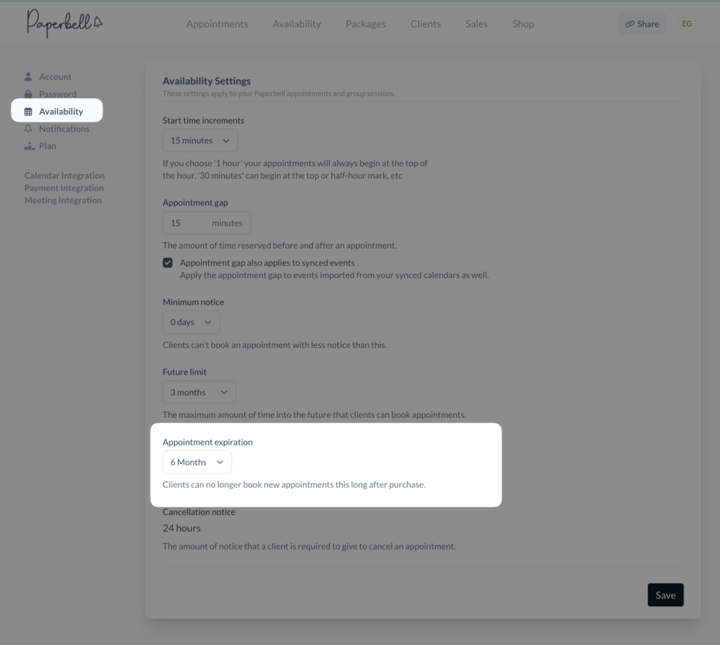 Appointment expiration determines when the appointments in a package will no longer be available to be booked. Read more about it here.