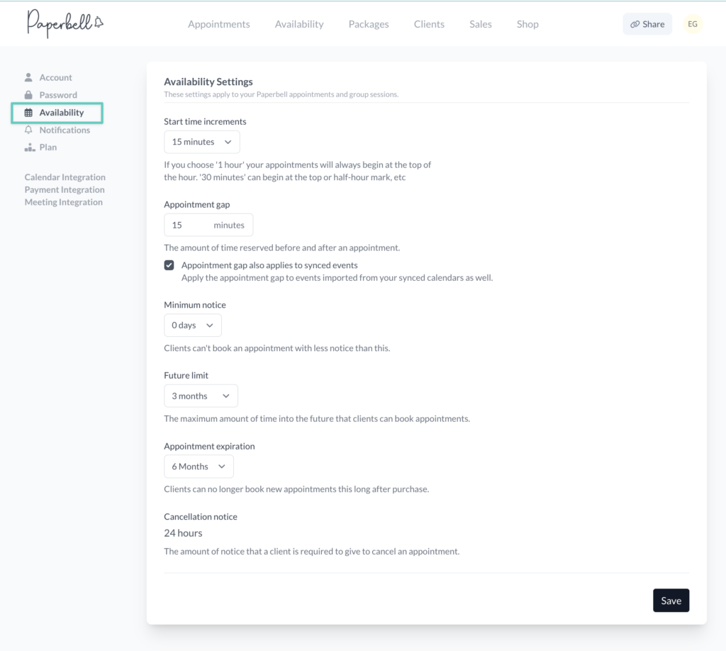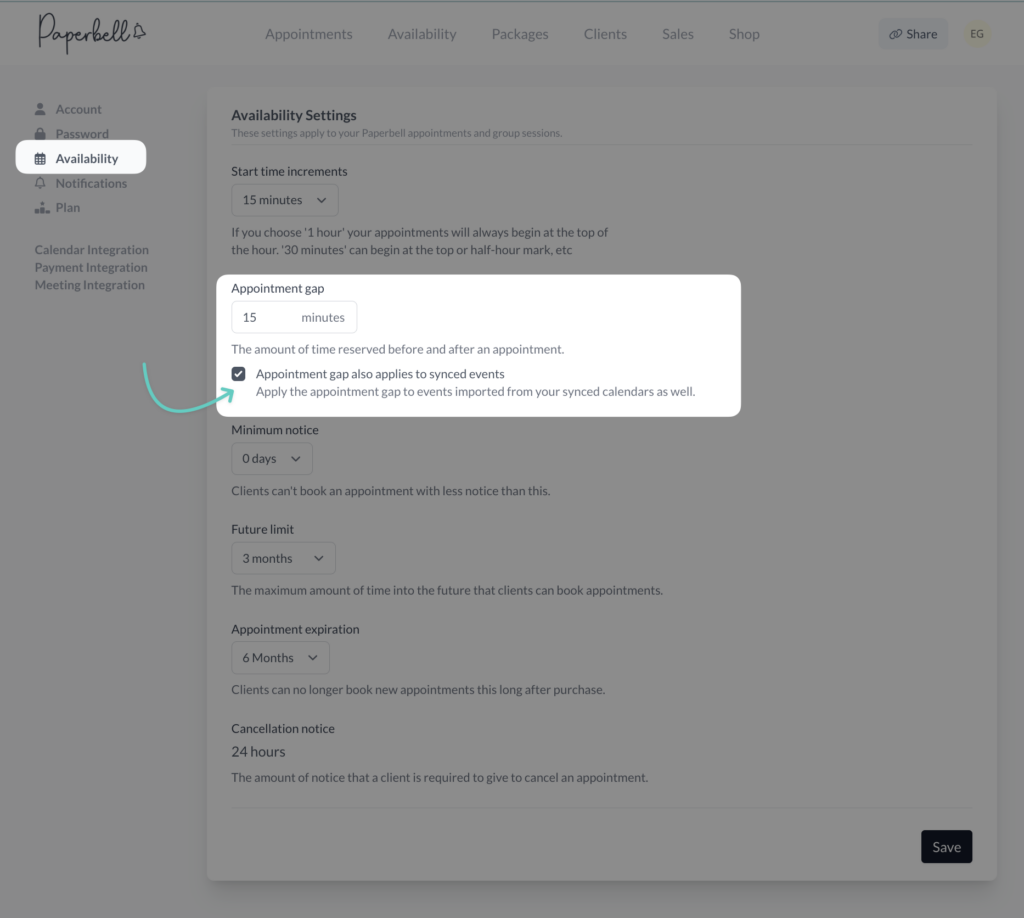 The appointment gap setting tells Paperbell if you would like to schedule gaps before and after your appointments. (This is sometimes called a buffer.) Many customers like to have a 5 or 10 minute window in between appointments– use the gap setting on your package page to make that happen.