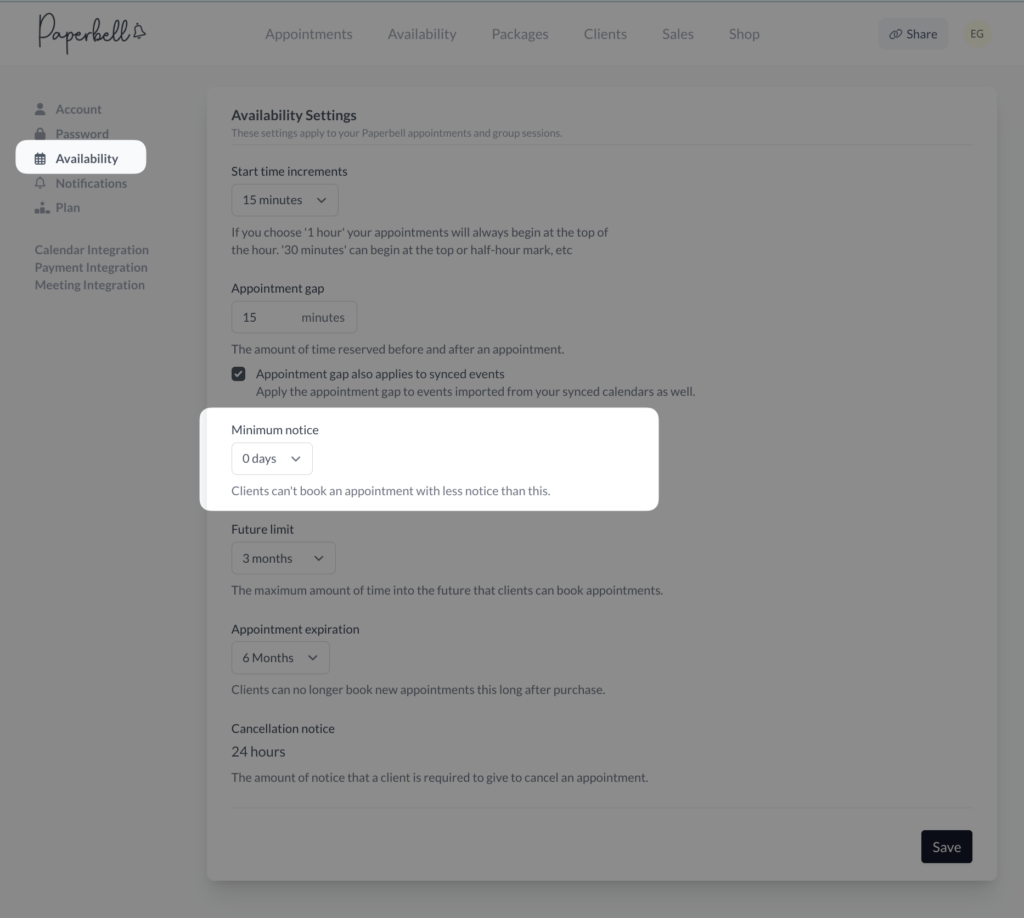 Minimum notice stops clients from making last-minute appointments that you might miss. If you choose “none,” clients will be able to make appointments at any available time, even if it’s 5 minutes from now.