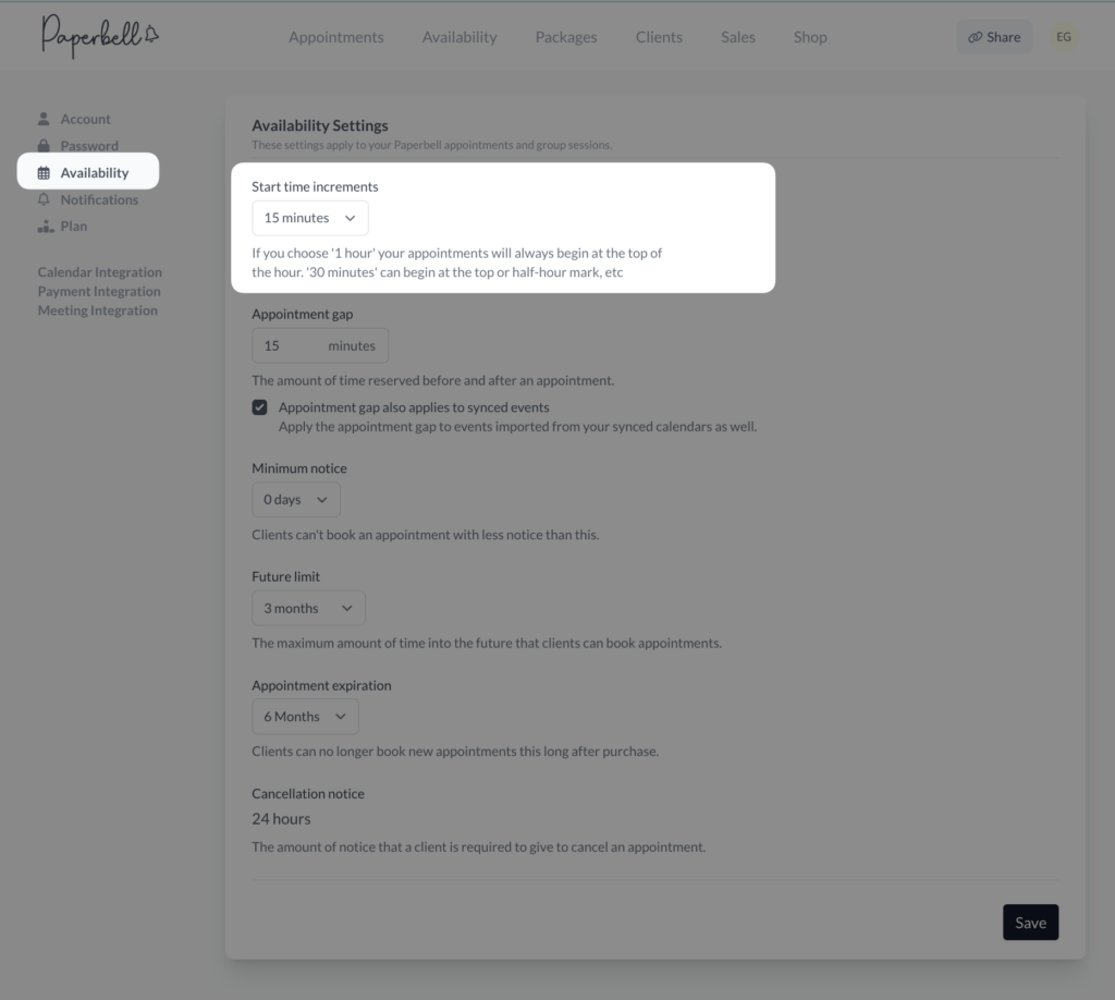 Start time increments determines when appointments can begin. If you choose ‘1 hour’ your appointments will always begin at the top of the hour. ’30 minutes’ can begin at the top or half-hour, and 15 minutes can start at :00, :15, :30 or :45