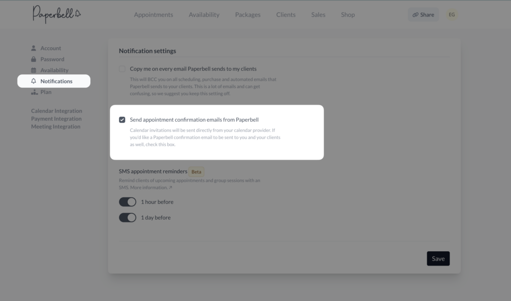 Your calendar app will send event invitations to your clients. If you’d also like Paperbell to send confirmation emails, check the box: