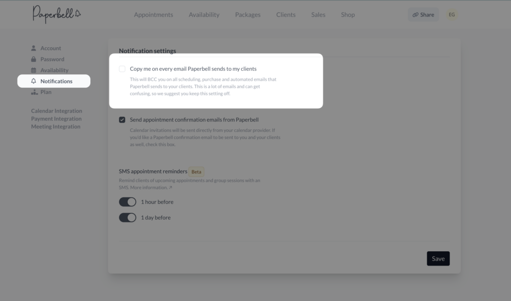 You can choose to be copied on every email Paperbell sends to your clients (but we don’t recommend it; if you want to check which emails your clients have gotten, you can find that in their client section.)