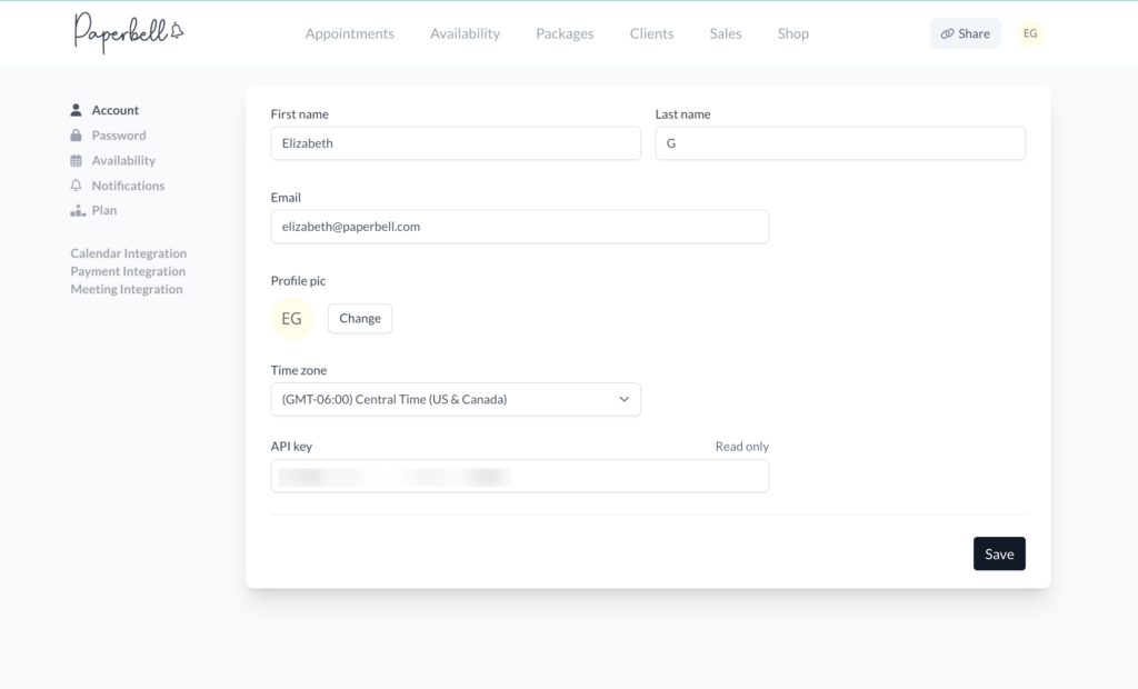 Find account settings such as your name, email address, profile pic, and time zone. Your first and last name will be used in emails to clients that are generated from Paperbell.