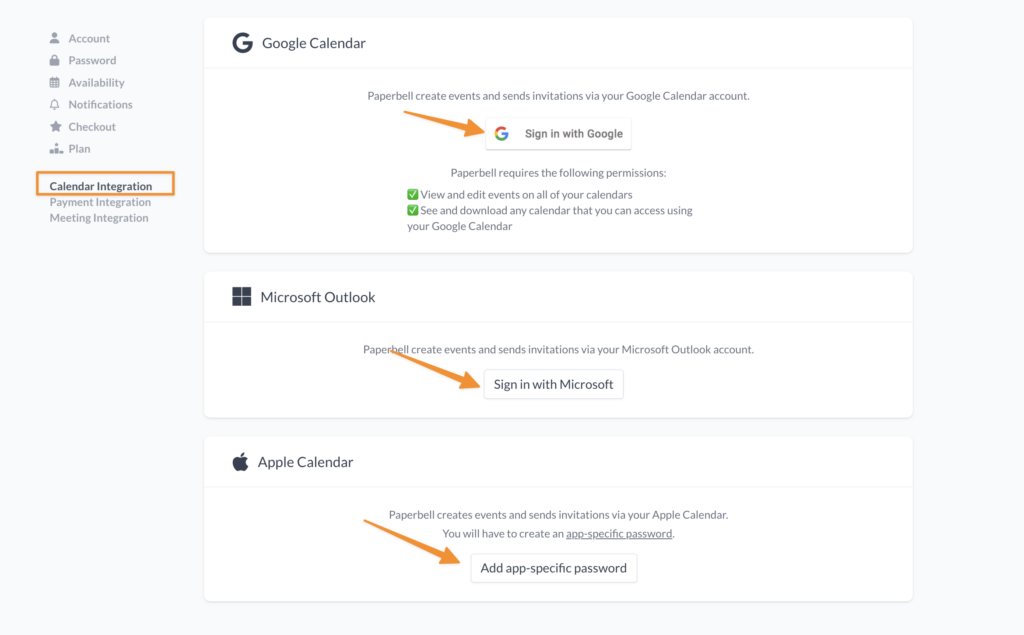 This is the section where you’ll sync your external calendar (Google, Outlook, or Apple) with Paperbell.