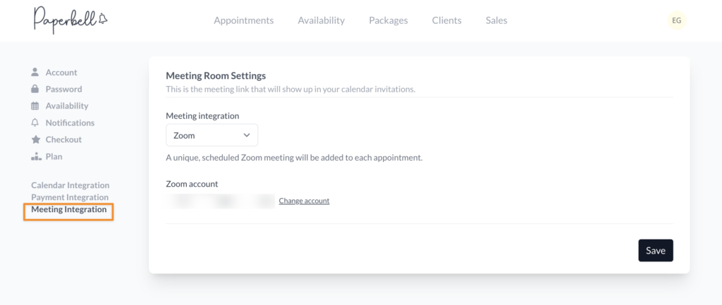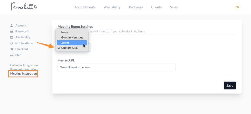 Find your Meeting Room Settings here. You have the option of automatically including a custom URL for all appointments to let you and your client know how you’re connecting. You can include the URL to a meeting room such as Zoom, your phone number, or conference line details.