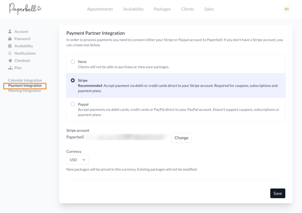 Connect a Stripe or PayPal account here. When using PayPal, double-check that the email address submitted is the same one on your PayPal account.