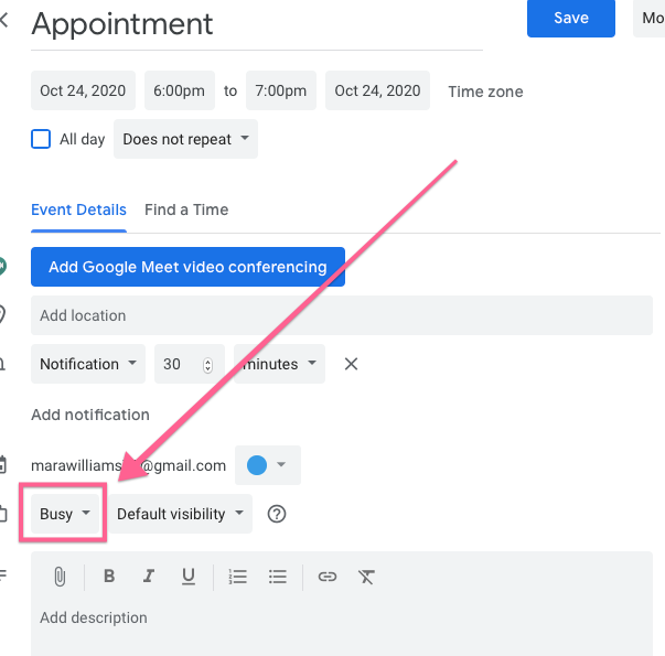 Here’s where things get weird: if you have an “all day” event, Google marks you as free by default. This means that if you put an all day event like “TRAVELING TO GREECE DON’T BOOK ME” Google will actually mark you as “free”! Find that Busy/Free dropdown and change it to “Busy” to actually keep it blocked off.