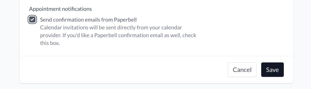 If you don’t set up and save any automated emails, Paperbell will send your client a purchase receipt and your calendar provider will send appointment notifications. If you’d like Paperbell to also send your clients a confirmation email when they book a session, check the box in your Scheduling Settings.