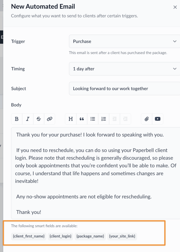 In the example above, the trigger is “Purchase,” so the smart field options are {client_first_name}, {client_login}, and {package_name} and {your_site_link}.