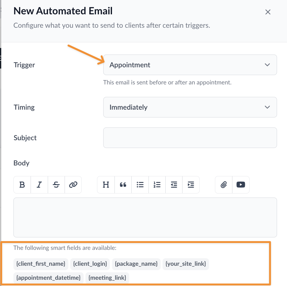 For an automated email triggered by an appointment, you’ll have different options: {client_first_name}, {client_login}, {package_name}, {your_site_link},{appointment_datetime}, and {meeting_link}.