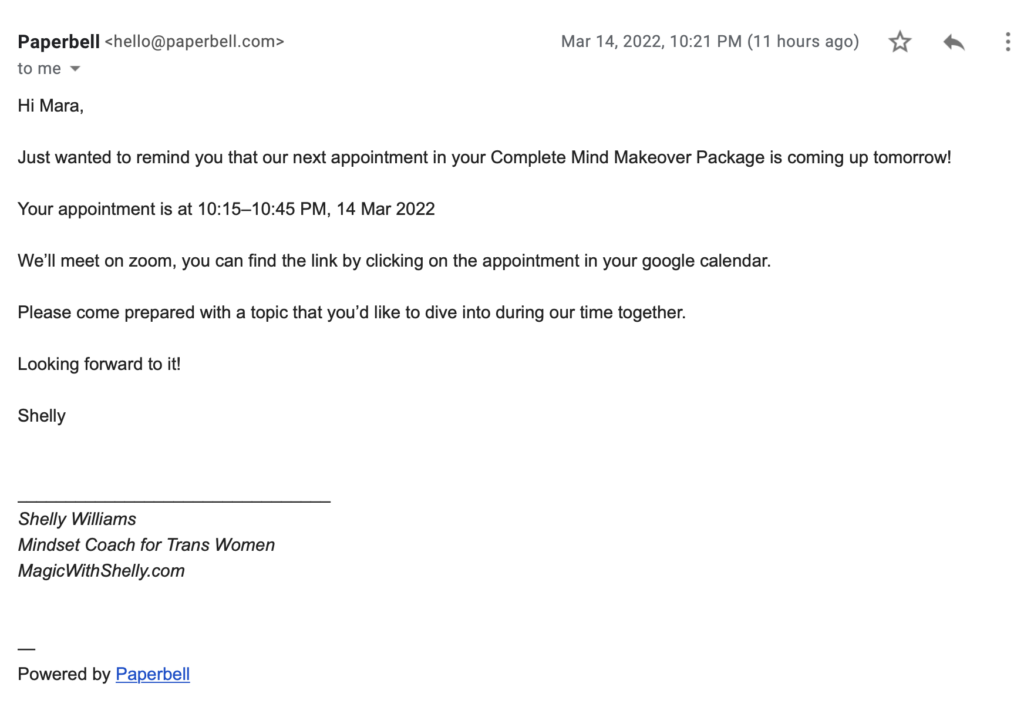 | Hi {client_first_name}, Just wanted to remind you that our next appointment for {package_name} is coming up tomorrow! Your appointment is at {appointment_datetime} We’ll meet on Zoom at {meeting_link} (you can also find this link on your Google Calendar invite). Please come prepared with a topic that you’d like to dive into during our time together. Looking forward to it! Shelly ________________________________ Shelly Williams Mindset Coach for Trans Women MagicWithShelly.com |