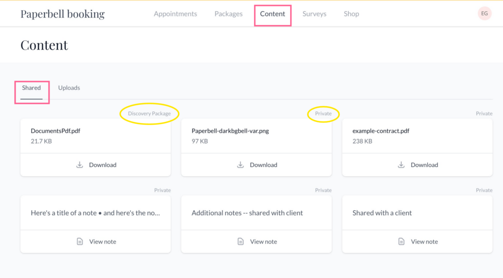 Clients will see notes you’ve shared with them, as well as any private or package-wide content. They can also upload content to share with you.