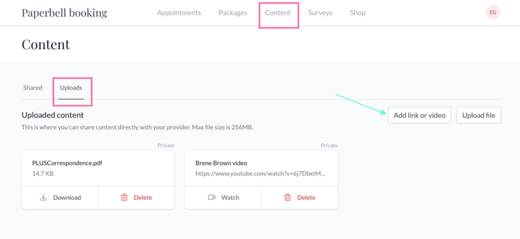 Clients can also add content for you. To share files or links with you, they’ll click into the Content section, and then the Uploads tab:
