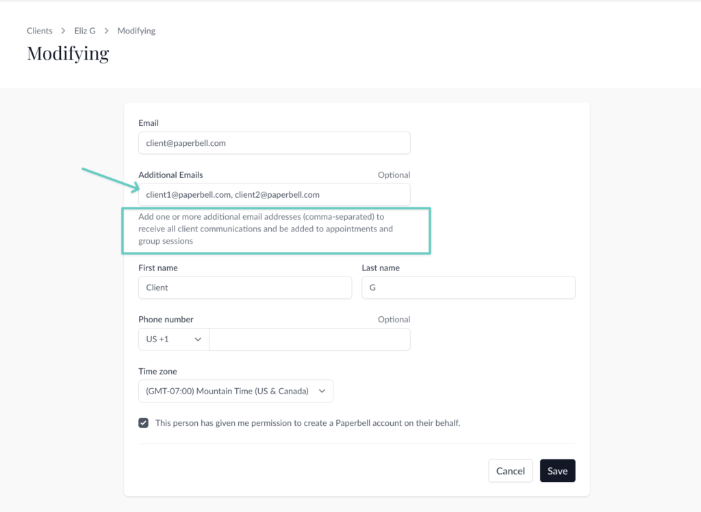 Go to the client’s profile and click the “modify” button at the top right of the screen. This will allow you to change their name, email address, phone number, and time zone.