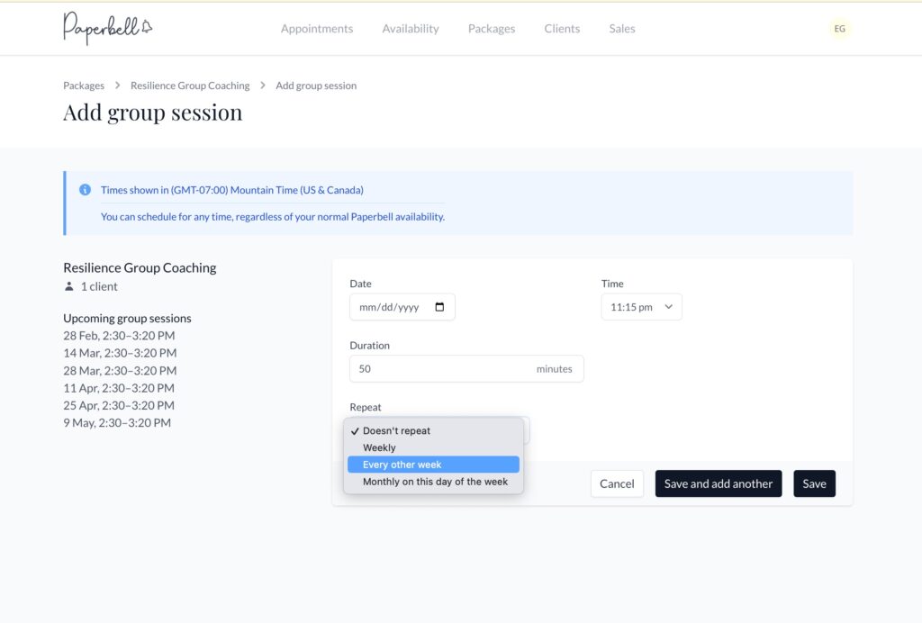 You can set up recurring group sessions as well. Choose from weekly, monthly, or every other week, and clients will be invited to the whole series.