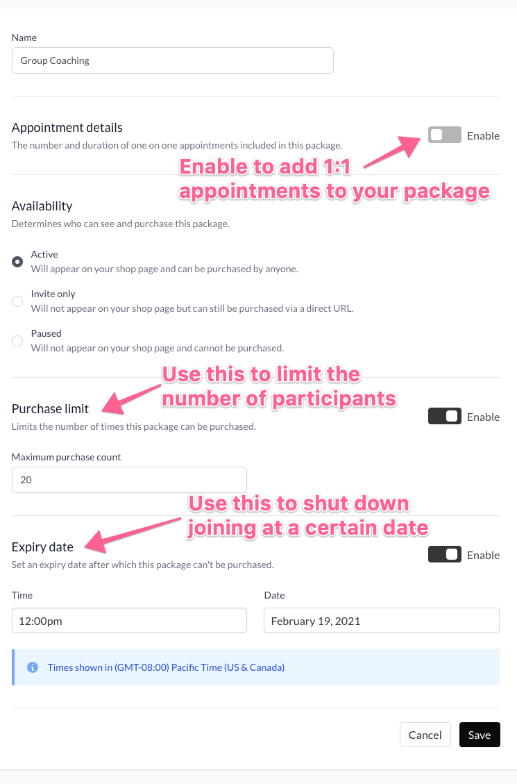 - Enable “Appointments” if you’d like to include 1:1 appointments in the same package. For example, you might create a package with 4 group coaching sessions and one 1:1 kickoff session.