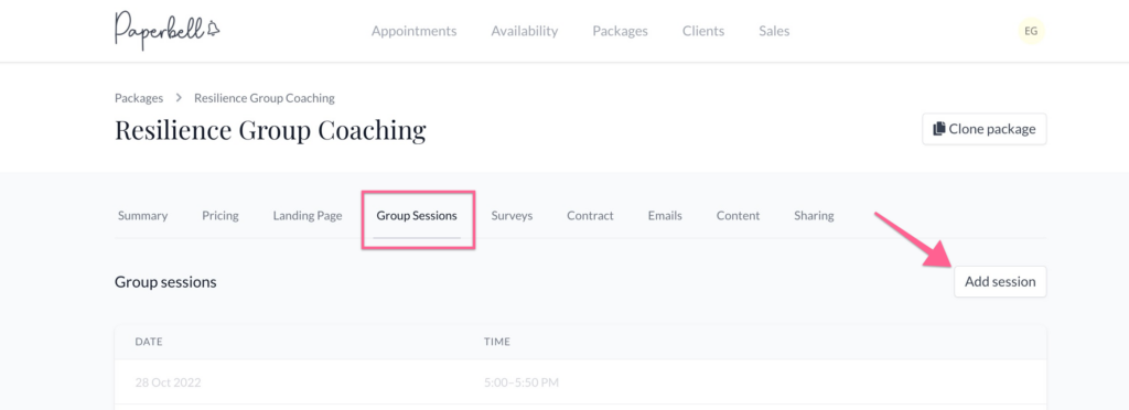 After you’ve completed the set up, look for the Group Sessions tab in your package. Set the date and time for your group appointments, and all clients with that package are automatically invited.