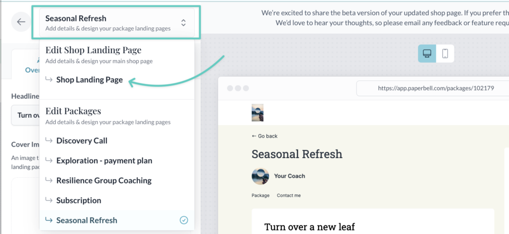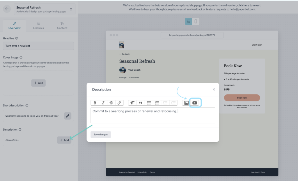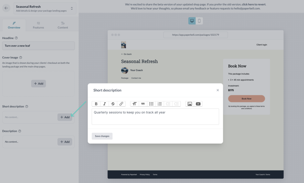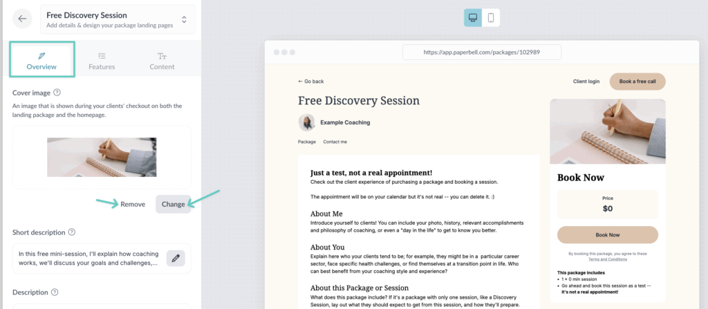 Paperbell automatically creates a custom landing page for each coaching package. You can link to this page to educate your clients about your packages and allow them to schedule and purchase.