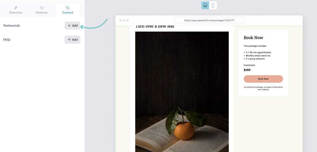 Click on the Content tab to add testimonials to your package and FAQs.