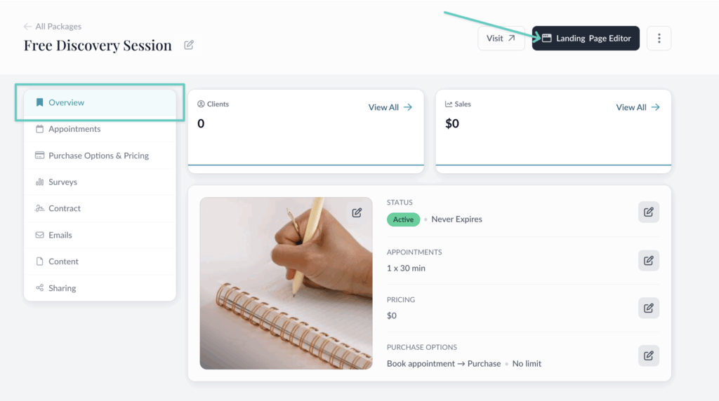 To edit the package’s headline, click the Overview tab. You can add a cover image to your package that will show up on the landing page and on your site’s homepage.