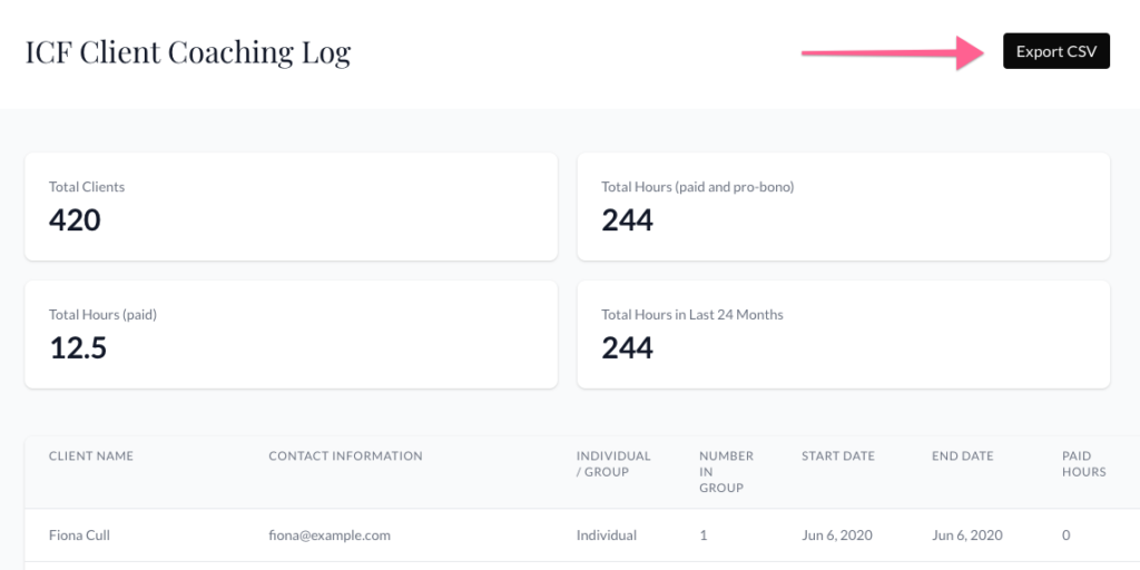 Go to your ICF Client Coaching Log and click the “Export CSV” button. This will automatically start a download of your entire client history of coaching hours from Paperbell.