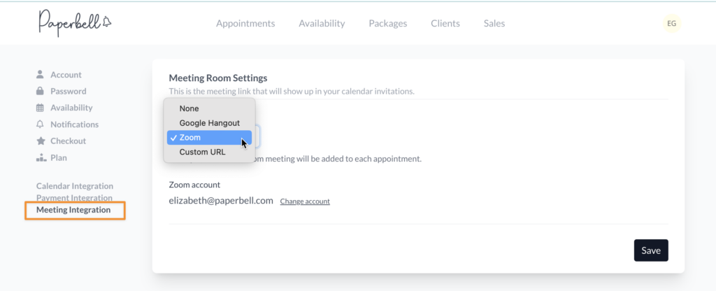 If you prefer to use the same link for each meeting, don’t use the Zoom integration and instead enter your Zoom personal meeting ID in Paperbell’s meeting URL field, here’s how to do that. )