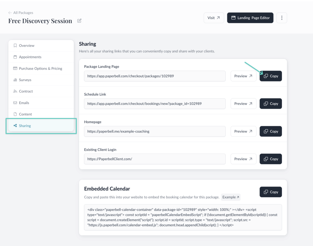 You can also grab the URL that clients see once they’ve clicked the “Book now” button on a package page. This is a great option if you like to host your package pages on your website and want to send clients straight to the booking/payment process in Paperbell.