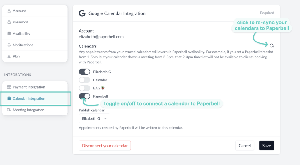 When you check the box to sync a calendar, Paperbell will pull your “busy” times from that calendar and not allow your clients to book conflicting calls.