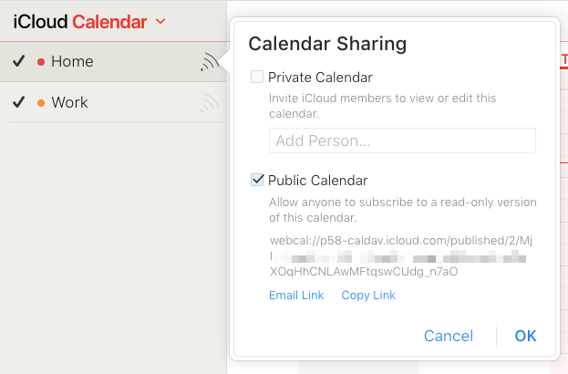 This will create two links: an HTML link and an ICS link. The HTML link allows people to view your calendar in a browser and the ICS link will enable people to import your calendar into their calendar program.