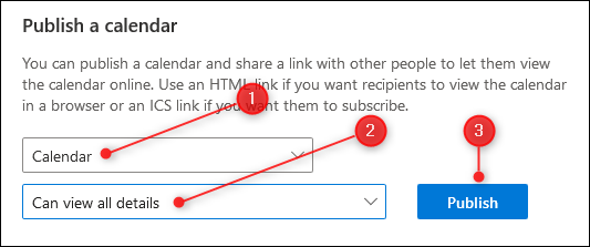 4. In the “Publish a calendar” section, choose the calendar you want to share (if you’ve only got one Calendar set up it will just be called “Calendar”), select “Can view all details” in the second dropdown, and click “Publish.”