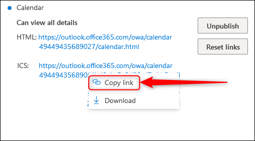 5. Click the ICS link, and a menu will appear. Select the “Copy link” option to copy the link to your clipboard.