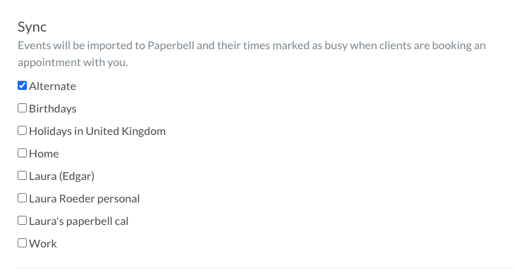 7. Go to your Paperbell calendar sync settings and make sure to check the boxes to “sync” any iCal calendars you have imported. Note that they will appear as their calendar name in iCal (the defaults are “work” and “home”)
